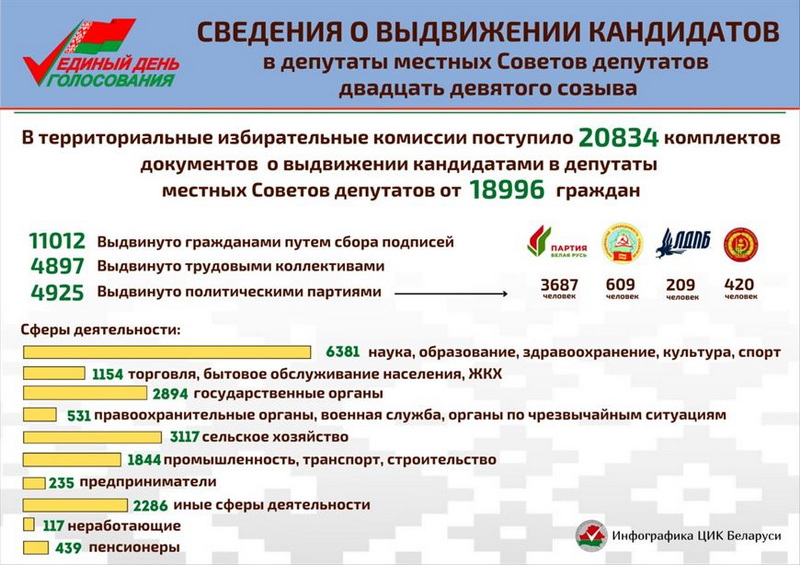 "На выборы в местные Советы депутатов выдвинуты 18 996 кандидатов. Из них 871 выдвинут в областные и Минский городской, 6 927 - в районные Советы. 773 человека выдвинуты в городские Советы депутатов в городах областного подчинения и 316 - в городские Советы в городах районного подчинения, 65 - в поселковые и 10 044 - в сельские Советы депутатов", - рассказал Игорь Карпенко.